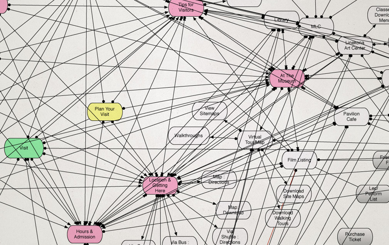 Interacting with museum properties is a sensory explosion of color, texture, and architecture that sets a bright tone for how visitors will engage with the exhibitions and events. Using this as inspiration, we established three guiding principles for what users should experience when engaging with the new experience: intrigued, informed, enabled. Immediately we looked towards solutions that would feel immersive without competing against the art. And defined an information architecture that would be intimate yet discoverable. Ensuring vital functions like donations, class schedules, and event calendars could be easily accessed. While elements like exploring the collection and browsing exhibitions could be rich and strung together.